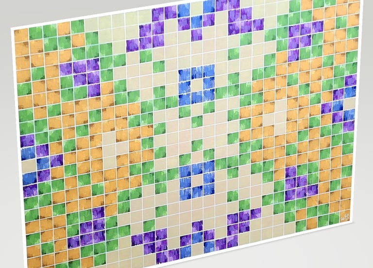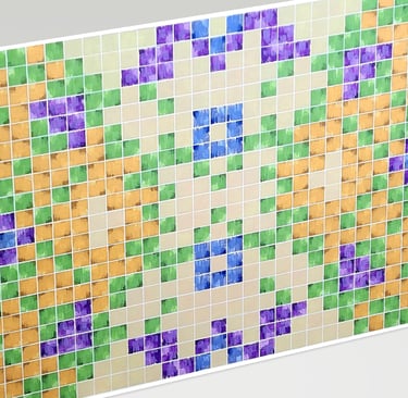 Este trabajo,compuesto con los tres colores secundarios,naranja,verde, violeta y el primario azul,tambien tiene un fondo calido,la intencion con la que fue creado de colores intensos se ha conseguido,tambien se ha conseguido una armonia de color en su conjunto,la obra ha utilizado el color azul como centro de interes,con esos dos cuadrados centrales que captan la atencion del observador,todo el conjunto tiene un cierto eco al OP-ART, y al ARTE GEOMETRICO, tambien la forma de depositar la pintura en cada uno de los cuadrados que componen el conjunto se podria denominar SEMIABSTRACTO la sensacion de dinamismo, y al mismo tiempo estabilidad acompañan la composicion.